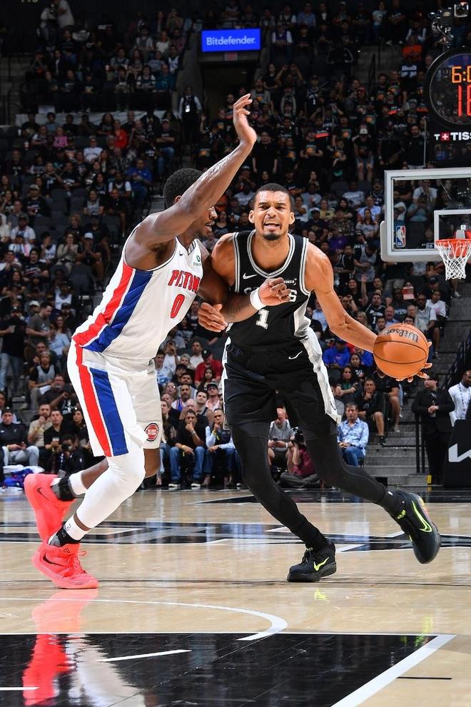 馬刺上一場(chǎng)客場(chǎng)131-91大勝76人,活塞上一場(chǎng)客場(chǎng)109-113惜敗騎士,本賽季首次交鋒馬刺客場(chǎng)114-103戰(zhàn)勝活塞。本場(chǎng)馬刺缺少巴恩斯、加西亞、普拉姆利,活塞缺少瓊斯。首節(jié)開局馬刺攻防壓制10-2領(lǐng)先,活塞追到差4分,雙方拉鋸戰(zhàn)纏斗。馬刺在24-19后,雙核率隊(duì)打出14-2攻勢(shì)擴(kuò)大17分優(yōu)勢(shì),斯圖爾特兩罰全中,首節(jié)結(jié)束馬刺38-23領(lǐng)先活塞。首節(jié)馬刺25中14,其中三分13中7,文班亞馬6中4得到12+3+2帽與福克斯9中6命中3記三分得到16分;活塞被限制僅有29中7,其中三分8中1,坎寧安7中1僅得到2分2助攻與杜倫5中2僅得到4+4+2犯規(guī)。